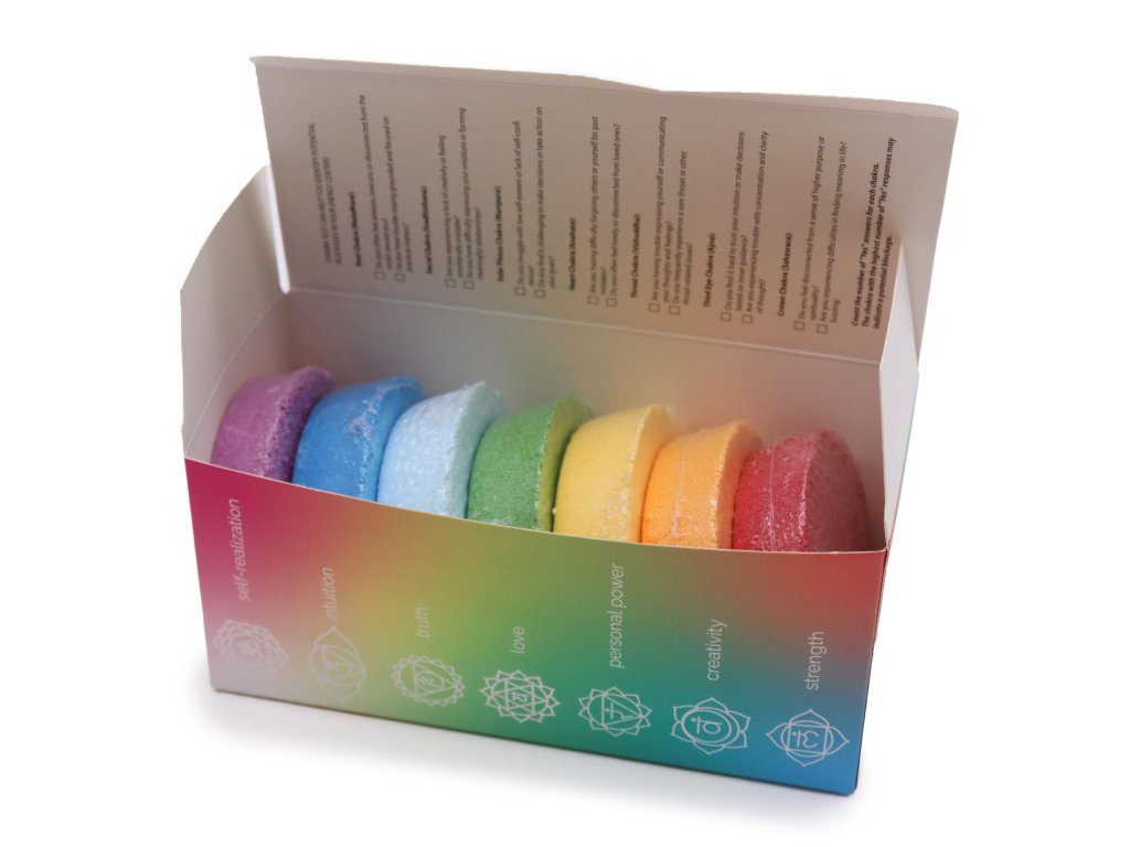 Sada koupelových bomb 7 čaker nabízí jedinečný koupelový rituál inspirovaný energií jednotlivých čaker. Každá šumivka je vyrobena s pečlivě vybranými esenciálními oleji a laděna do specifické barvy i vůně. Ideální jako dárek nebo pro chvíle relaxace a péče o sebe.
