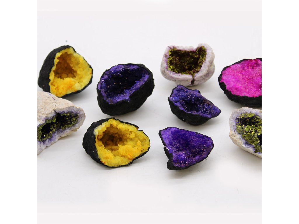 Krystaly uvnitř geody jsou nalakované, což zvýrazňuje jejich barvu a lesk. Geody patří mezi oblíbené trendy dekorace a jsou ceněné pro svůj jedinečný vzhled.