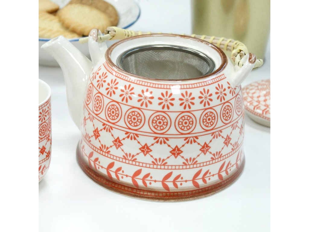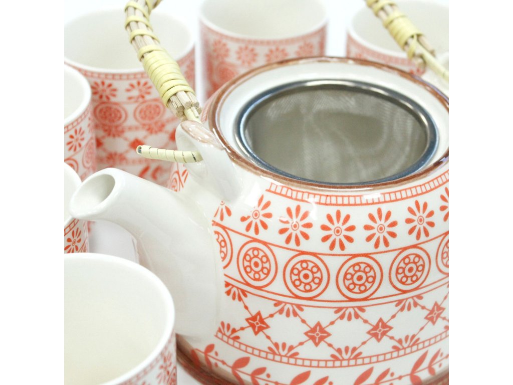 Čajová sada s keramickou konvicí a šesti šálky, doplněná kovovým sítkem, ideální pro přípravu sypaného čaje a klidné čajové rituály.