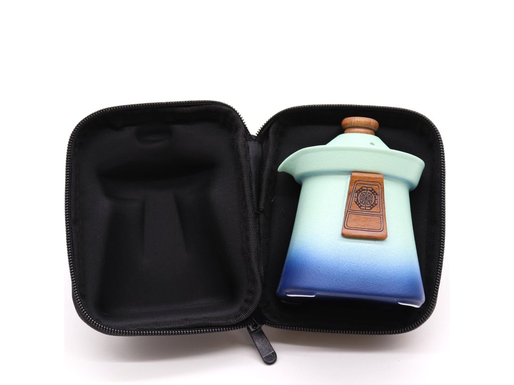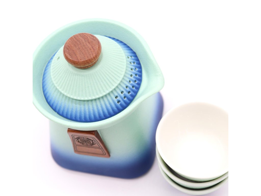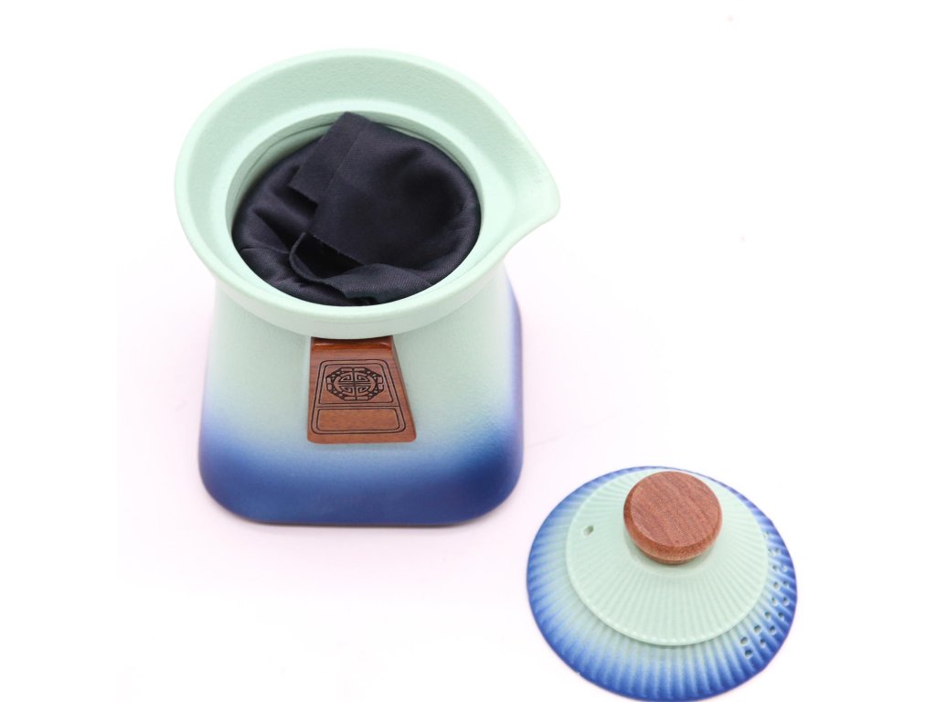 Teplý modro-tyrkysový přechod barev, inspirovaný tradiční keramikou, dodává sadě rustikální, ale zároveň nadčasový vzhled. Dřevěné detaily na rukojeti a víku podtrhují řemeslný charakter a přirozenou eleganci.