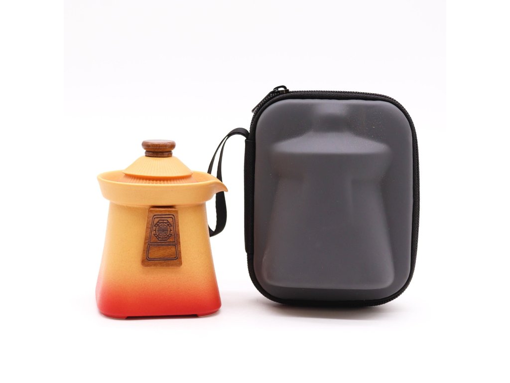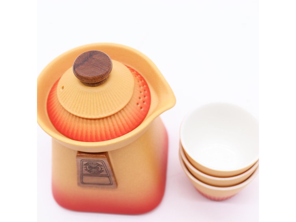 Teplý červeno-oranžový přechod barev, inspirovaný tradiční keramikou, dodává sadě rustikální, ale zároveň nadčasový vzhled. Dřevěné detaily na rukojeti a víku podtrhují řemeslný charakter a přirozenou eleganci.