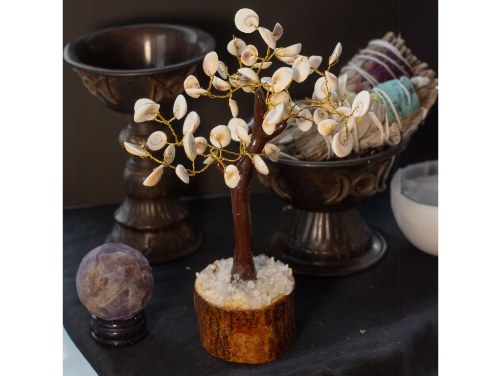 Velký kamenný strom obsahuje 60 nádherných gomatských čakrových kamenů.
