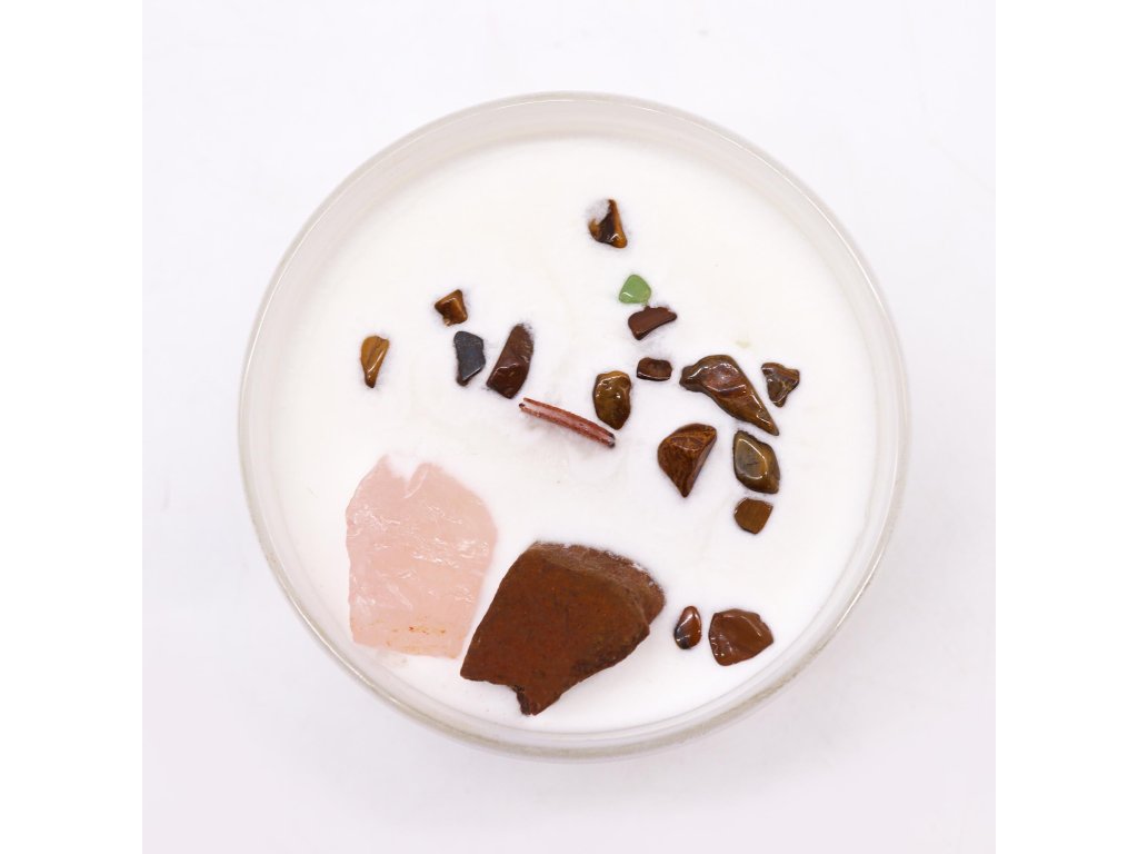 Svíčka je vytvořena z dynamické kombinace tygřího oka a růžového křemene, krystalů podporujících sebedůvěru, kreativitu, vášeň a emocionální otevřenost. Jejich energie rezonuje s esencí sakrální čakry a pomáhá rozproudit životní sílu, radost a smyslnost.