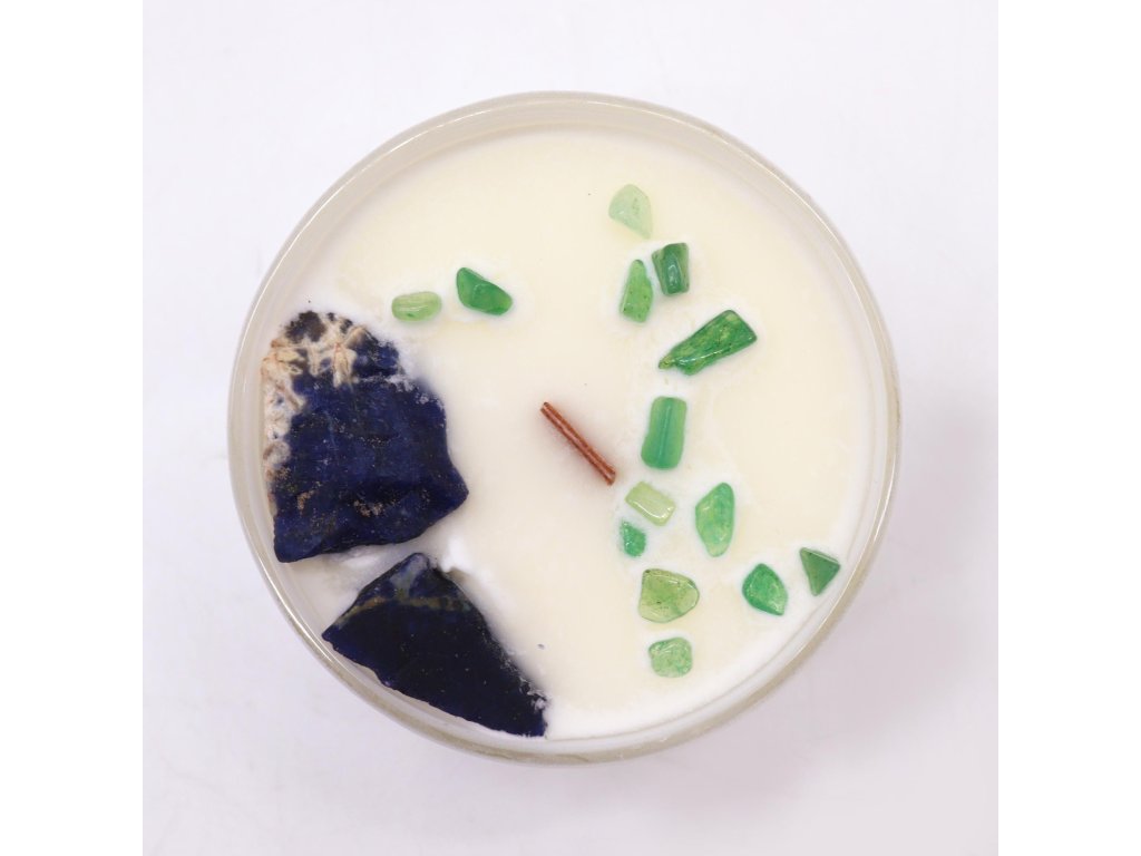 Svíčka je vytvořena z úlomků sodalitu a jadeitu, krystalů spojených s pravdivou komunikací, vnitřní rovnováhou a jasným myšlením. Jejich energie rezonuje s esencí krční čakry a pomáhá posilovat schopnost vyjádřit své myšlenky s klidem, jistotou a respektem.