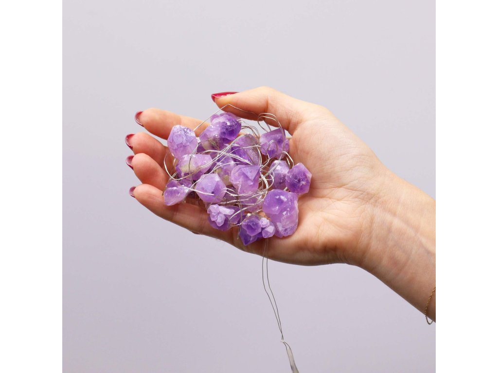 Gemstone Enchantment Lights představují okouzlující spojení přírodní krásy minerálů a moderního osvětlení. Tento dekorativní světelný řetěz s ametystovými kameny vytváří jemnou fialovou záři, která navozuje klidnou a harmonickou atmosféru v jakémkoli prostoru.