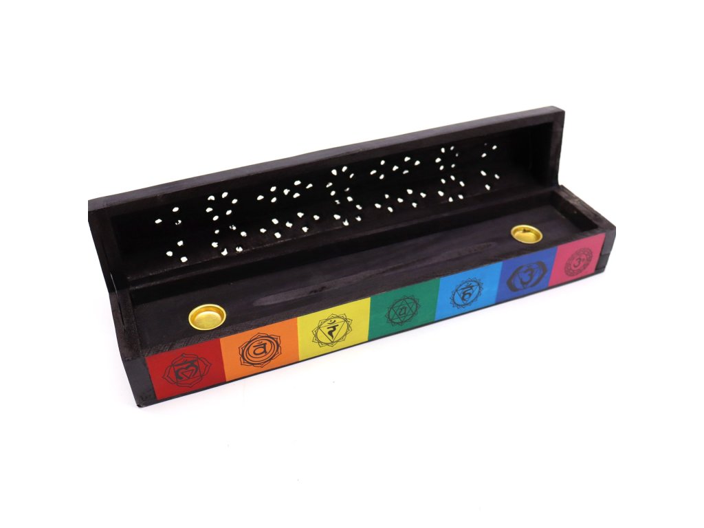 Krabička je vyrobena z kvalitních materiálů a zdobena sedmi barevnými čakrovými symboly, které představují jednotlivá energetická centra těla. Víko je opatřeno drobnými otvory, jimiž kouř jemně uniká ven, zatímco popel zůstává bezpečně uvnitř krabičky.