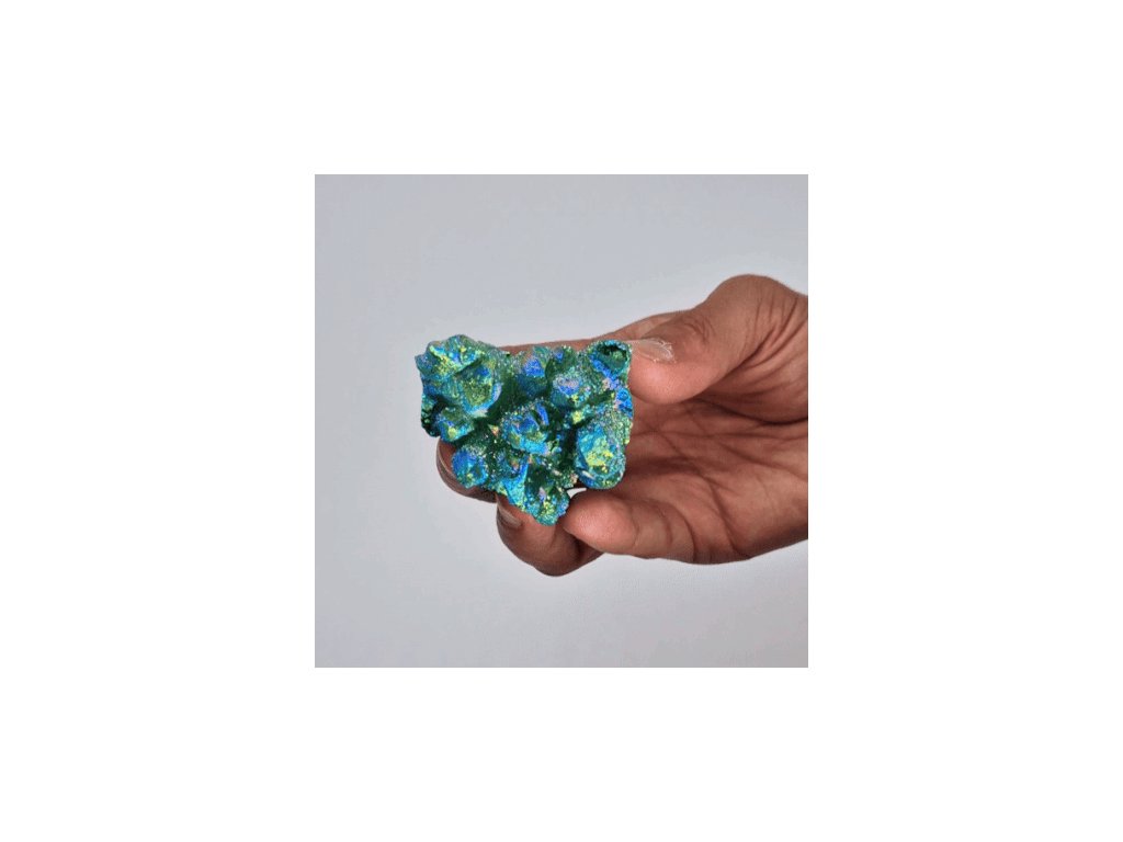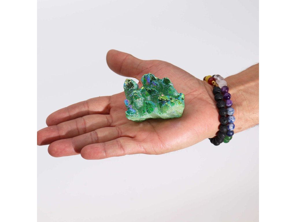 Green flame Aura křišťál s jemným duhovým leskem je oblíbený pro svůj čistý, svěží vzhled a jedinečný charakter. Každý kus je originál, liší se tvarem i intenzitou zbarvení a je vhodný jako dekorace, dárek nebo osobní talisman.