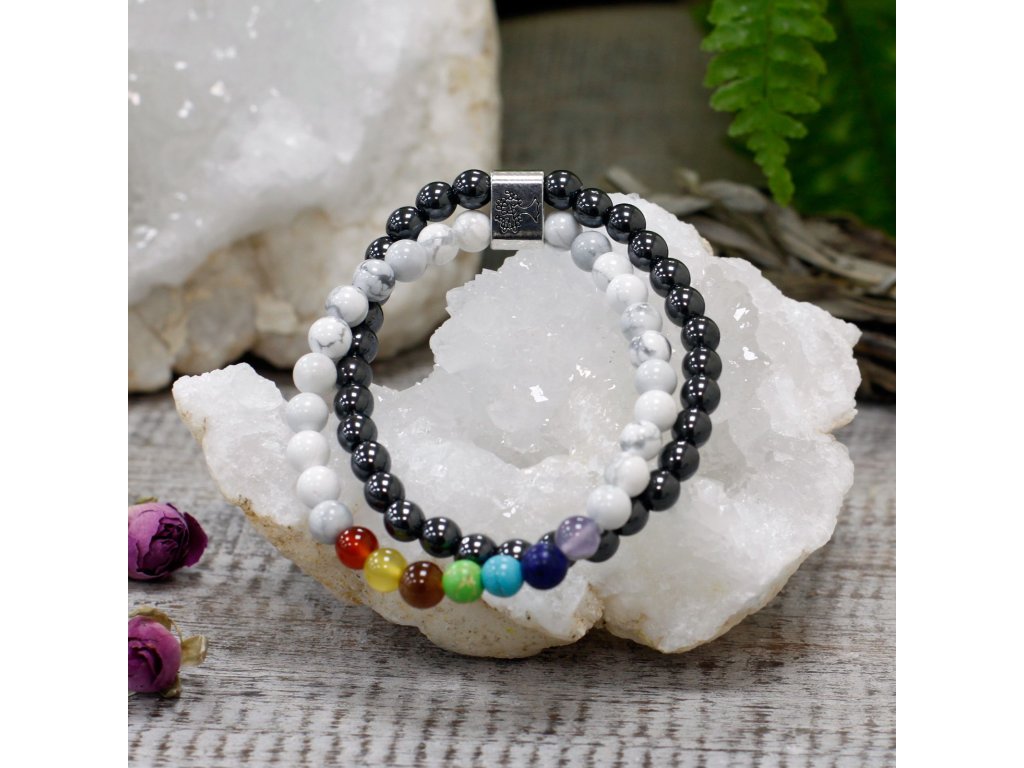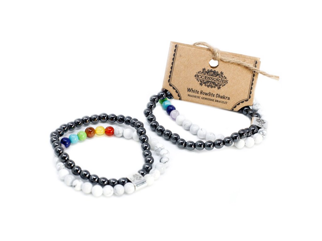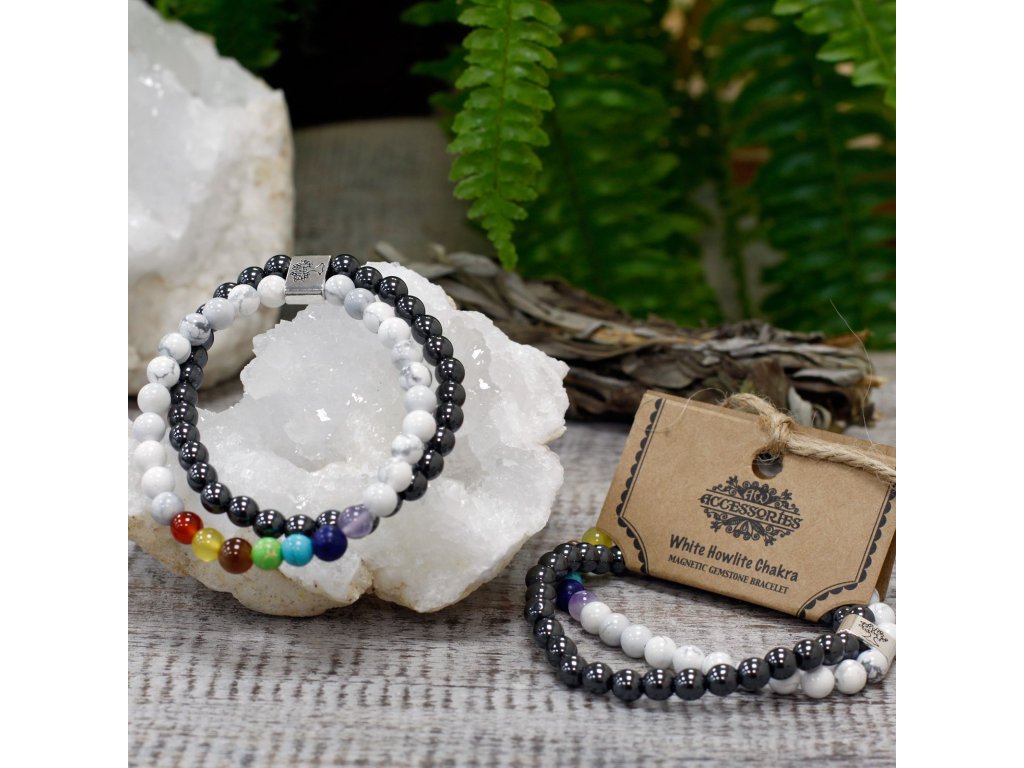 Magnetický křišťálový náramek z bílého howlitu s čakrami spojuje jemnou energii uklidňujícího howlitu s barevnými kameny představujícími jednotlivé čakry. Bílý howlit je tradičně spojován s klidem, trpělivostí a vnitřní rovnováhou, zatímco čakrové kameny symbolizují harmonii energetických center těla.