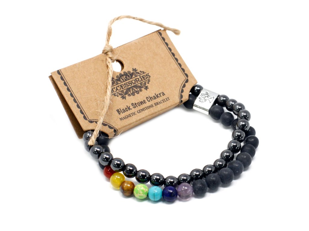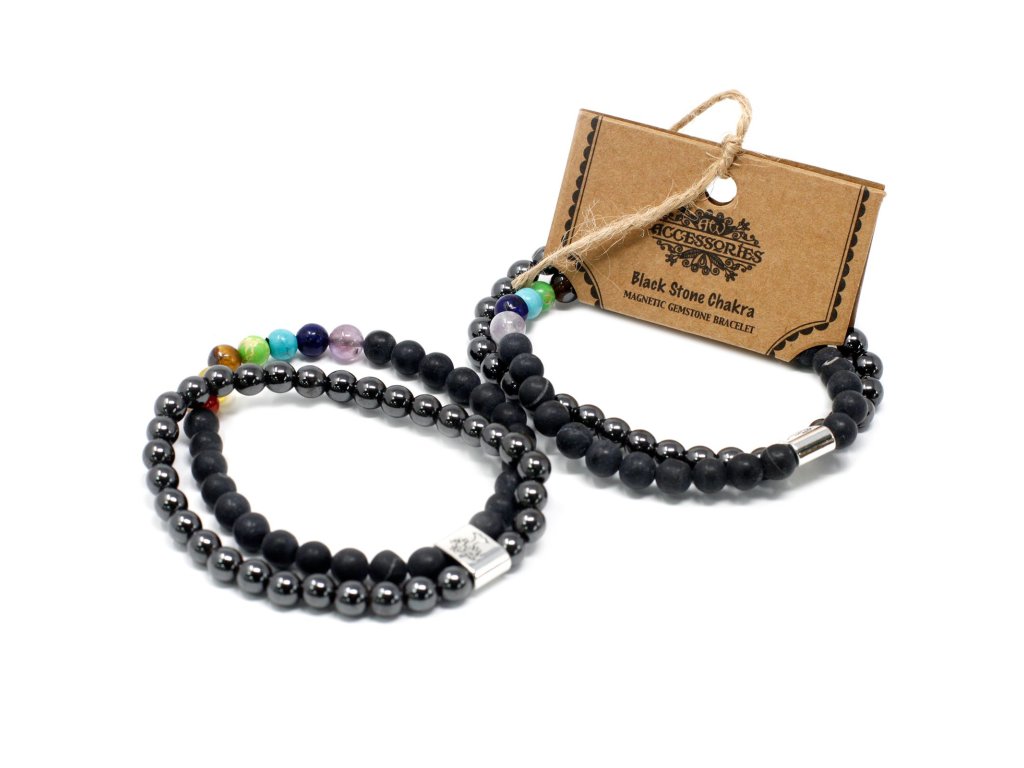Magnetický náramek z černých kamenů – čakry kombinuje sílu tmavých ochranných kamenů s barevnými prvky představujícími jednotlivé čakry. Černé kameny jsou tradičně spojovány s ochranou, uzemněním a stabilitou, zatímco čakrové kameny symbolizují rovnováhu a plynulý tok energie.