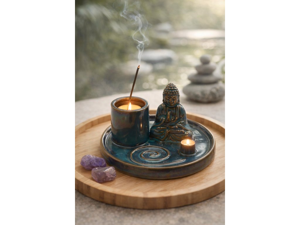 Keramický tácek/stojánek v modro-zelených tónech s jemným leskem. Dominantou je sedící Buddha v meditační pozici, který symbolizuje klid, rovnováhu a harmonii.
