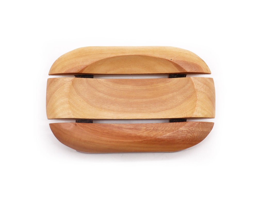 Mýdlenka z mahagonového dřeva v oválném tvaru je navržena s jemnými drenážními rýhami, které umožňují odtok vody a pomáhají udržet mýdlo suché. Spojuje praktickou funkci s klidnou estetikou přírodního materiálu.