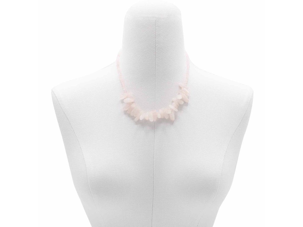 Náhrdelník s dlouhým růženínem je tvořen protáhlým kamenem doplněným řadou menších, kulatých minerálů. Jemné růžové tóny a přirozená struktura kamene vytvářejí harmonický a nadčasový šperk.
