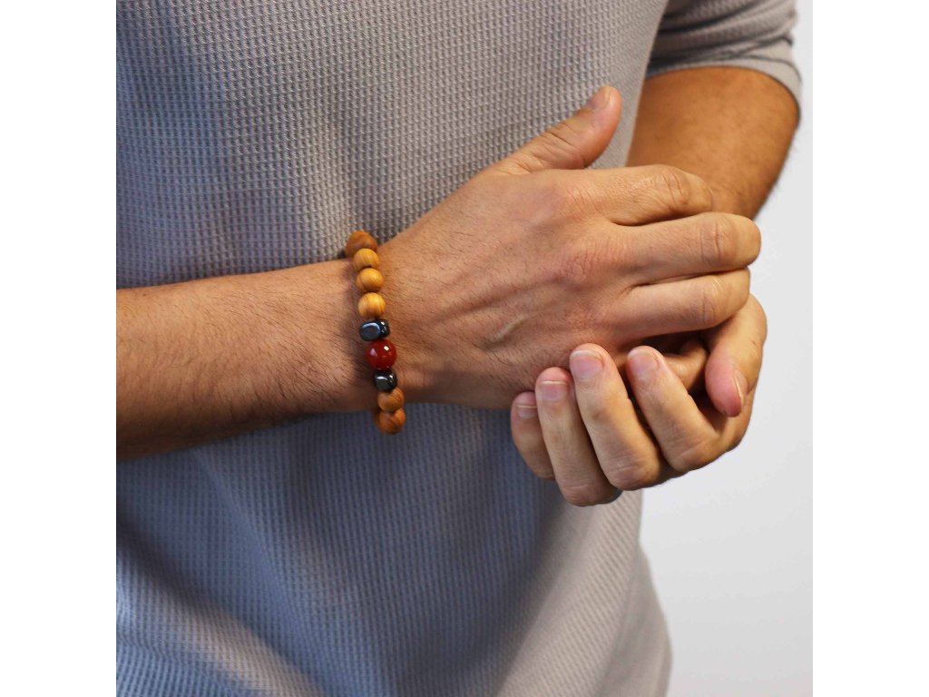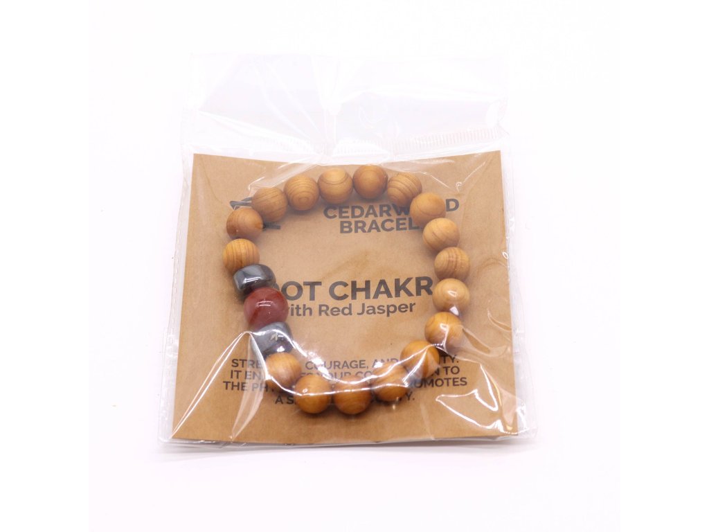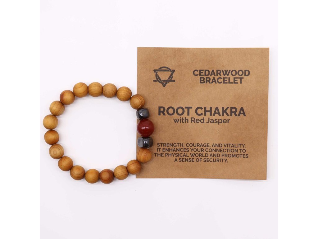 Náramek z cedrového dřeva s červeným jaspisem – Kořenová čakra propojuje přirozenou energii cedrového dřeva s posilující silou červeného jaspisu, kamene tradičně spojovaného se stabilitou, odvahou a uzemněním. Tato kombinace vytváří harmonický doplněk, který podporuje pevné zakotvení, vnitřní klid a pocit jistoty.