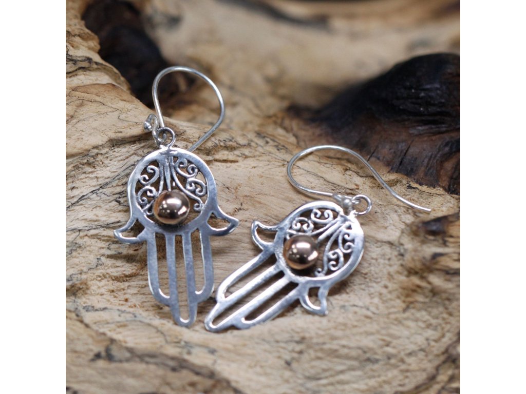 Tyto elegantní náušnice Hamsa jsou ručně vyrobeny z kombinace ryzího stříbra 925 a 18karátového zlata, čímž spojují jemnost, symboliku a nadčasovou krásu. Minimalistický design podtrhuje precizní řemeslné zpracování a lehkost celého šperku.
