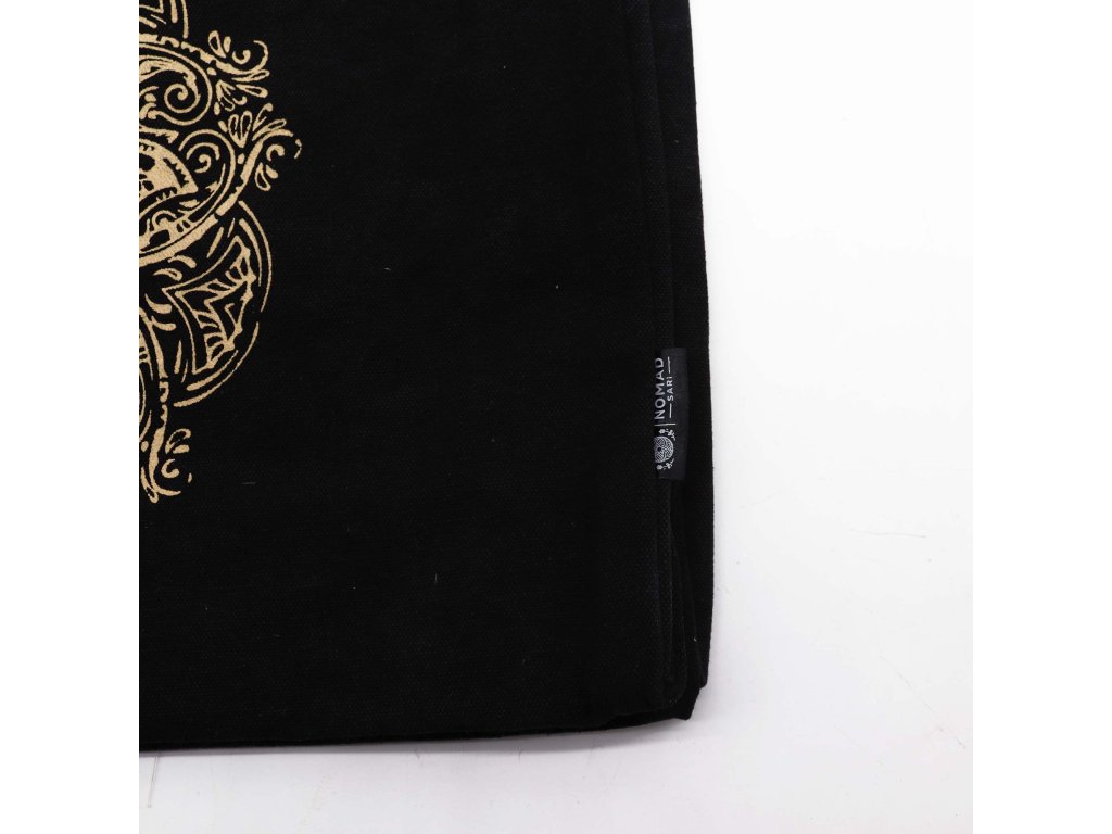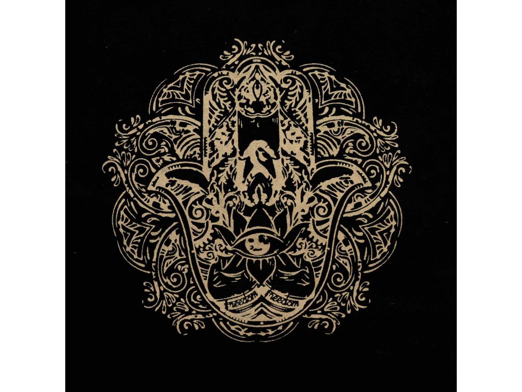 Zlatý potisk zobrazuje ruku Hamsa v detailním květinovém stylu, který evokuje eleganci, harmonii a prvky posvátné geometrie. Čokoládový stonewash odstín dodává tašce přirozený, lehce vintage vzhled a činí každý kus jemně odlišným.