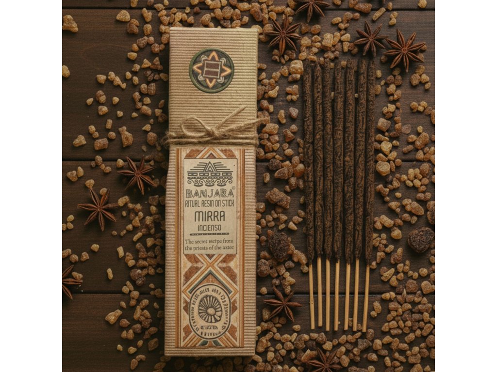 Ritual Resin on Stick – Myrha jsou ručně vyráběné pryskyřičné vonné tyčinky pocházející z Indie, inspirované starověkými duchovními tradicemi. Při hoření uvolňují hlubokou, zemitou a balzámovou vůni, která podporuje očistu prostoru, vnitřní klid a duchovní reflexi.