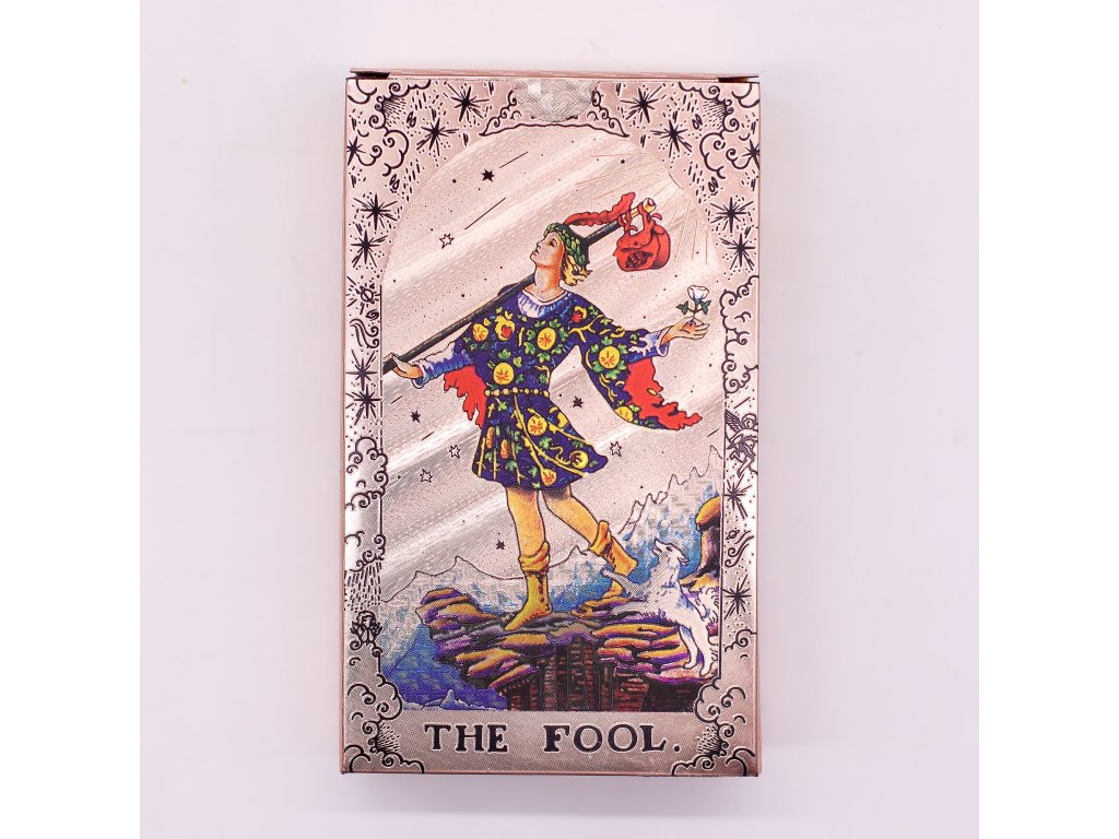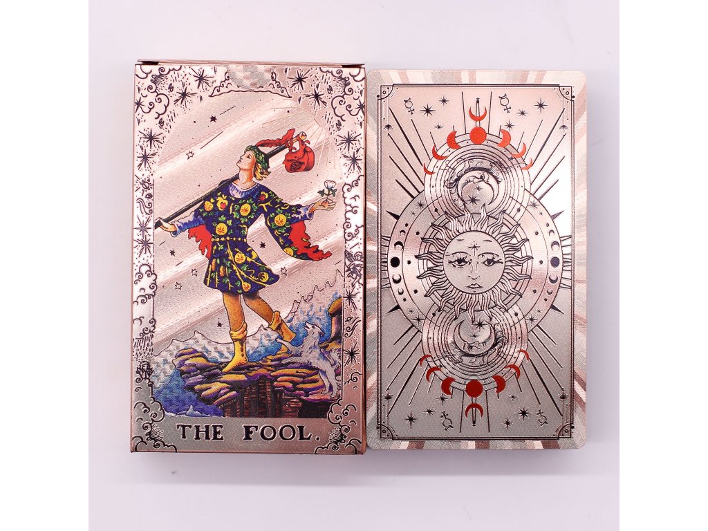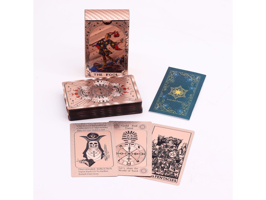 Sada tarotových karet s fólií z růžového zlata - Měsíční fáze - s brožurou. 78 karet má jemný kovový lesk a složité nebeské motivy inspirované lunárními cykly. Přiložená brožura vysvětluje symboliku každé karty a návrhy šíření. Stylový, moderní balíček pro milovníky tarotu i milovníky měsíce. Sada je v angličtině.