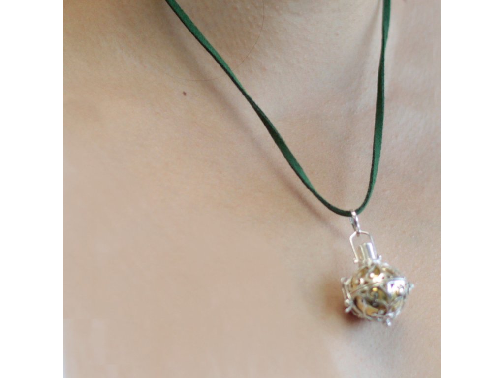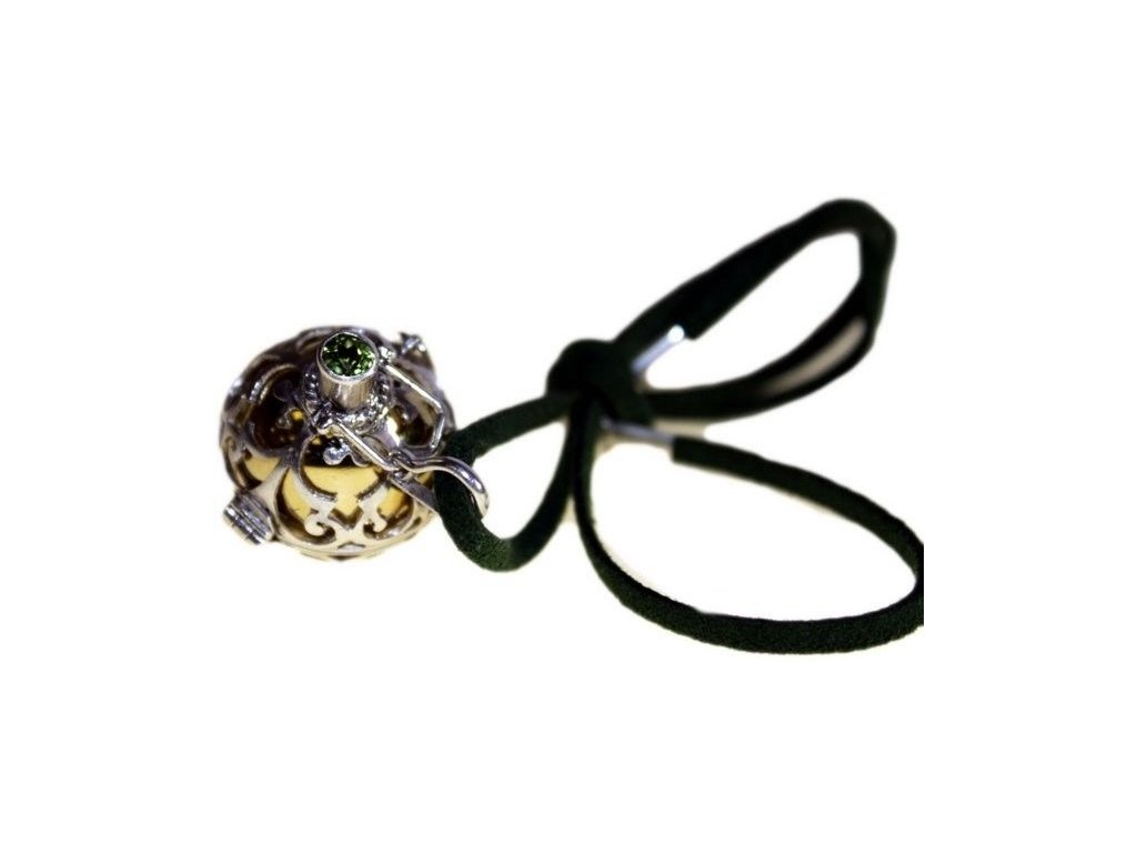 Rolnička je zavěšena na šňůrce na krk se stříbrnými detaily a sponami, díky čemuž je pohodlná na nošení a zároveň působí elegantně. Samotné rolničky jsou vyvážené a mohou být z mosazi nebo kombinace keramiky a pryskyřice, což zajišťuje jejich jedinečnost.