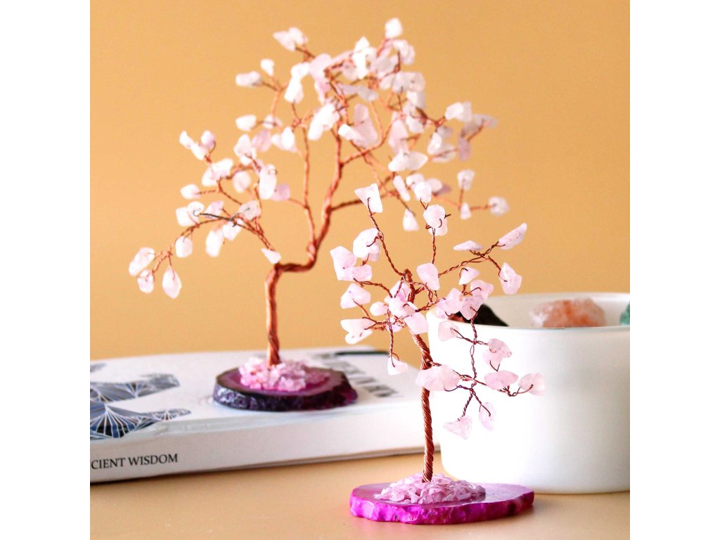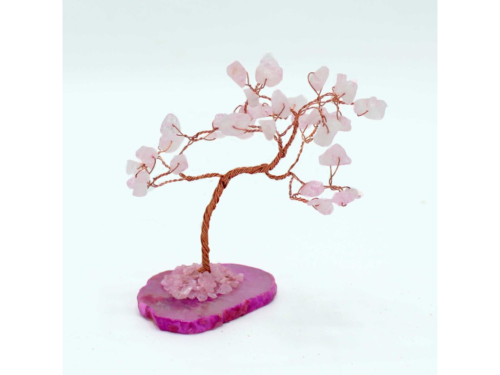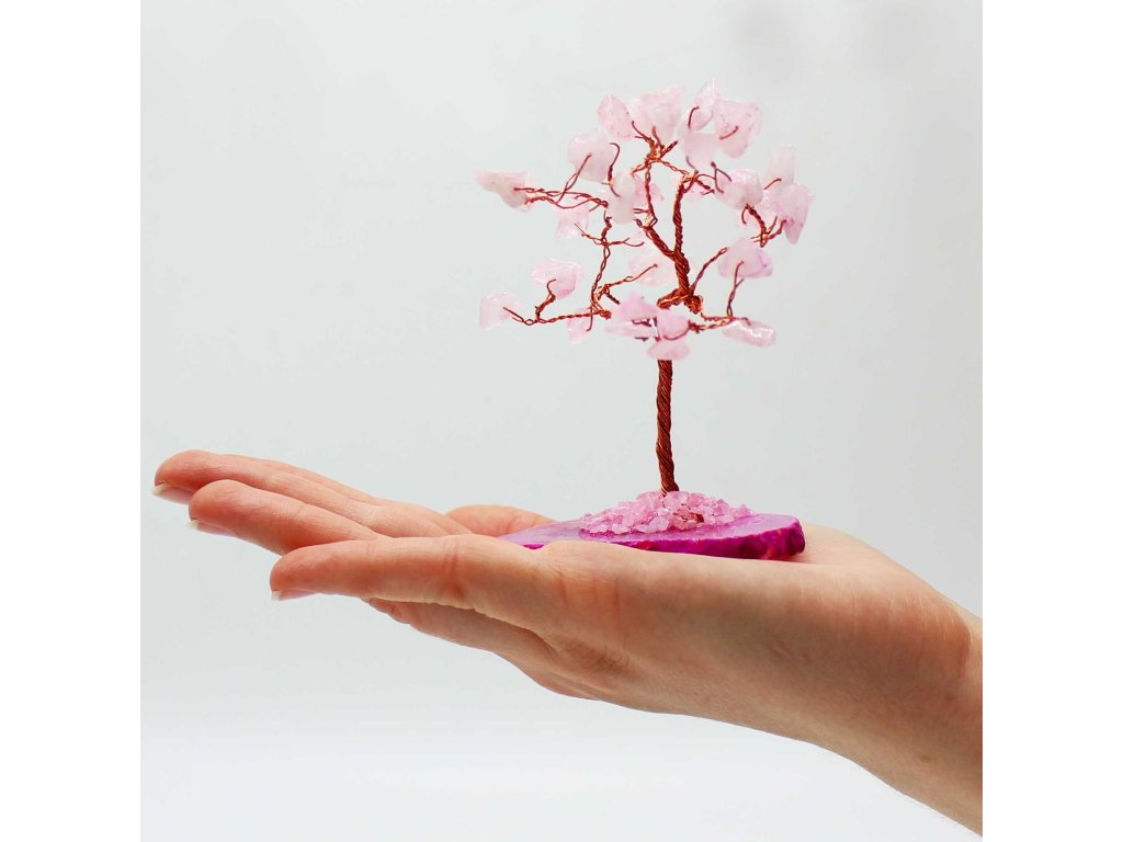 Růžový achát je tradičně spojován s láskou, soucitem a emocionální rovnováhou. Stromeček tak do prostoru vnáší klidnou, hřejivou atmosféru a působí jako harmonický prvek v interiéru domova, pracovny nebo relaxačního koutku.
