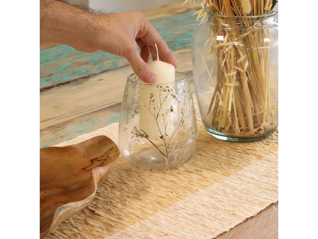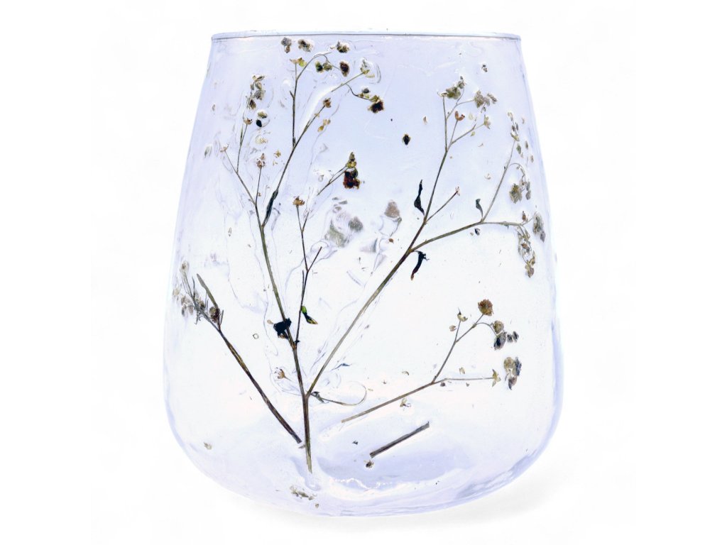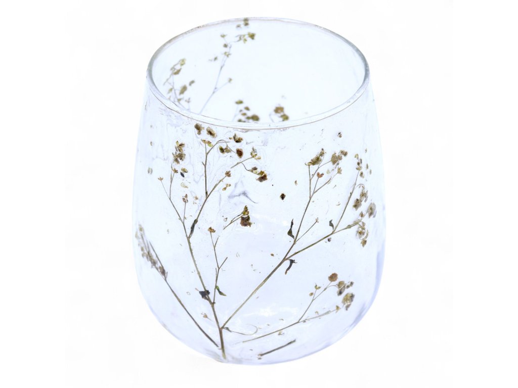 Ručně vyrobený skleněný svícen se sušenými květy, který vnese do interiéru jemné světlo a dotek přírody