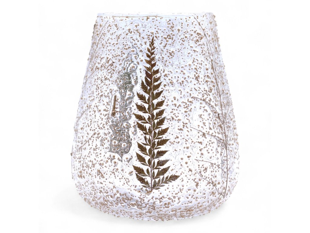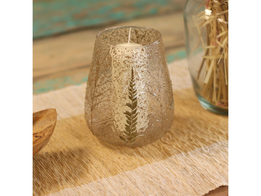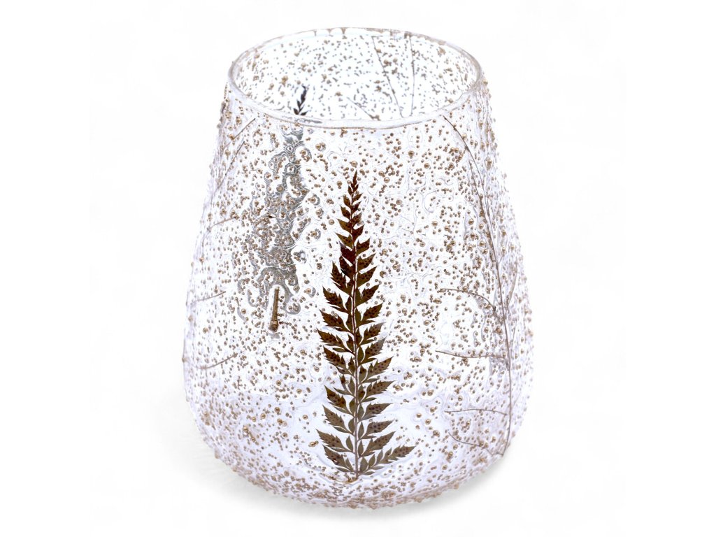 Ručně vyrobený skleněný svícen se sušenými květy, který vnese do interiéru jemné světlo a dotek přírody.