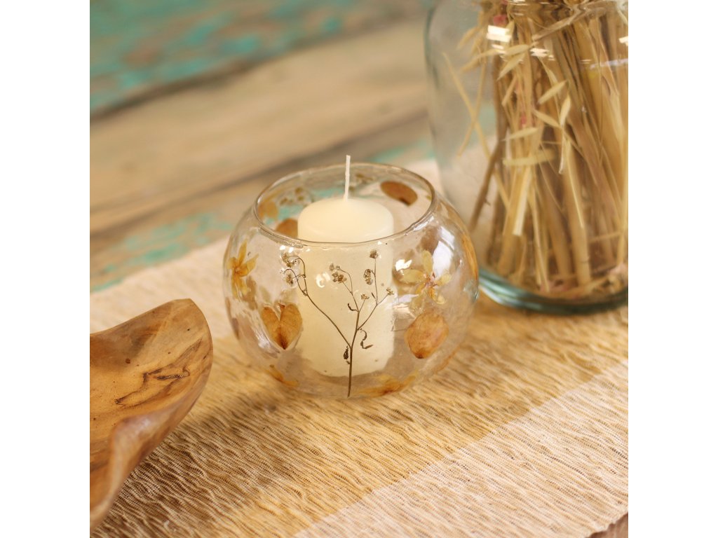 Ručně vyrobený skleněný svícen se sušenými květy, který vnese do interiéru jemné světlo a dotek přírody.