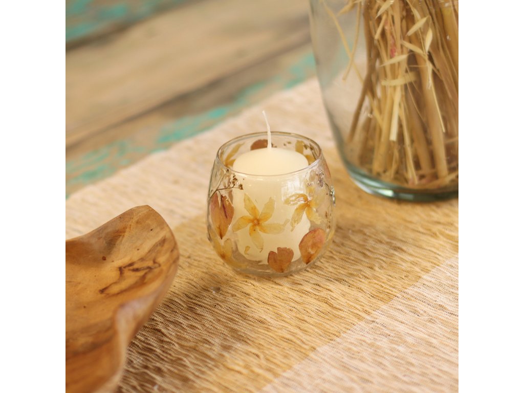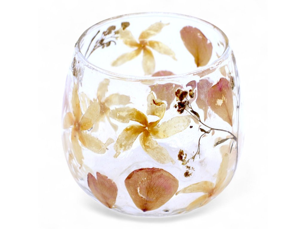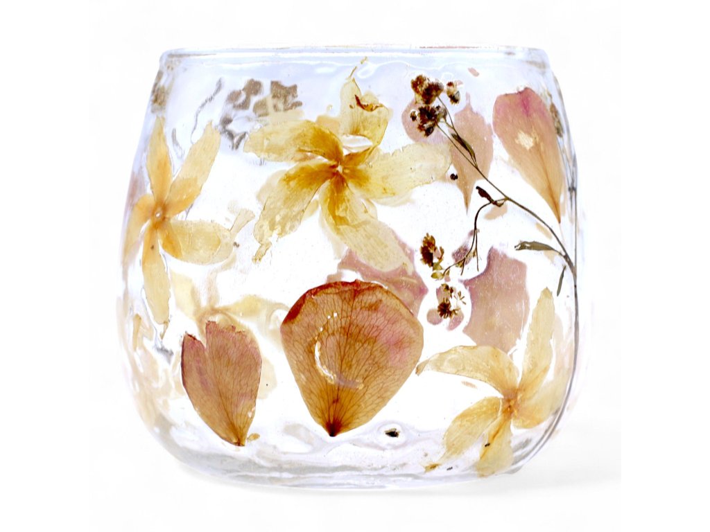 Tento ručně vyrobený skleněný svícen je navržen tak, aby do vašeho domova vnesl přirozené světlo a klidnou atmosféru. Obsahuje opravdové sušené květy, díky nimž je každý kus jedinečný a působí jako jemný přírodní dekorativní prvek.