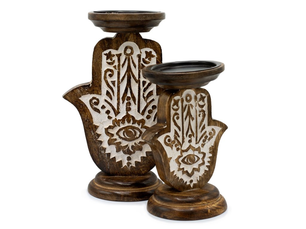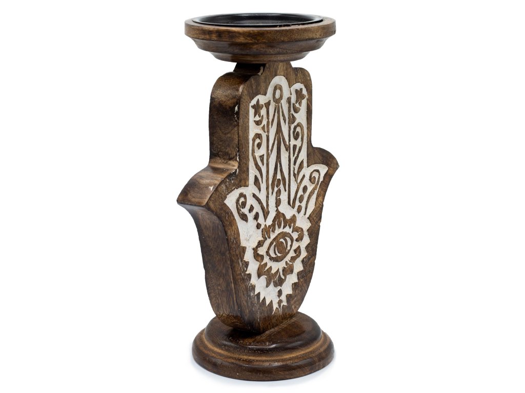 Tento velký svícen z mangového dřeva se symbolem Hamsa je ručně vyrobený dekorativní prvek, který vynikne v každém interiéru. Mangové dřevo je ceněné pro svou přirozenou kresbu, teplé tóny a udržitelný původ, díky čemuž je každý kus originálem.