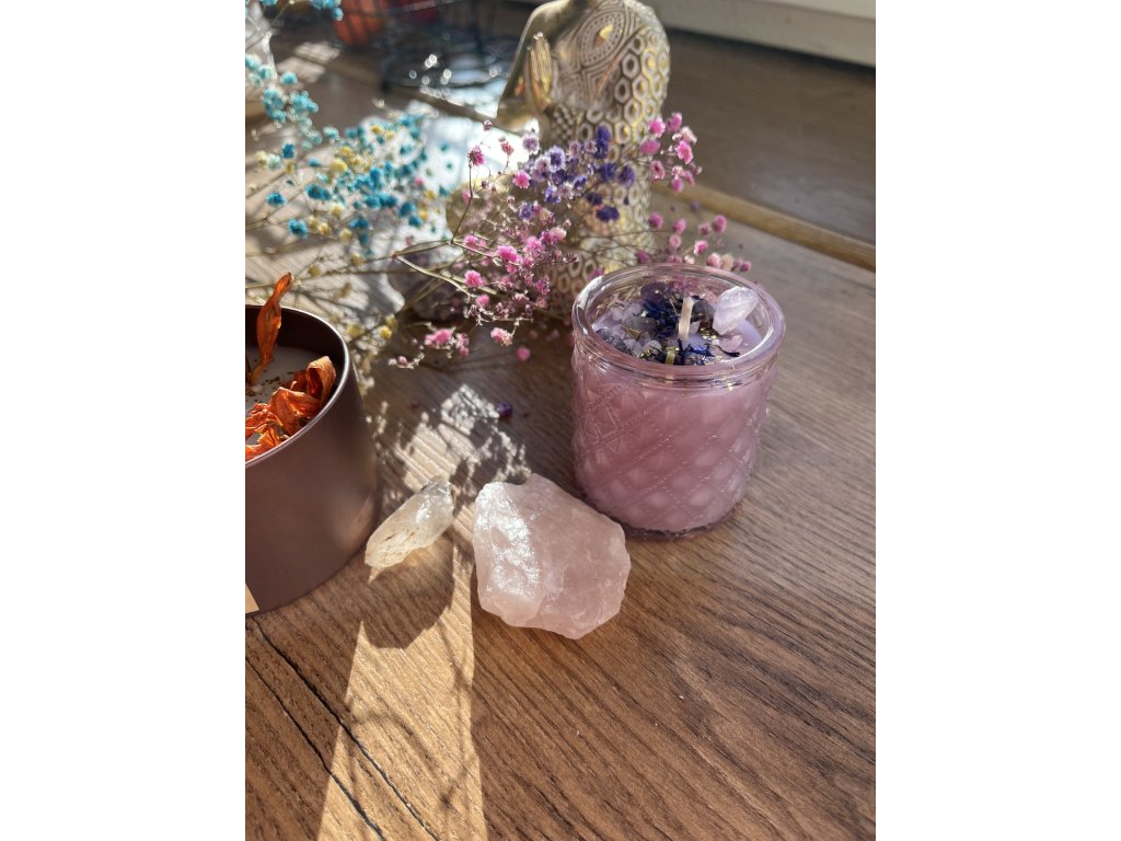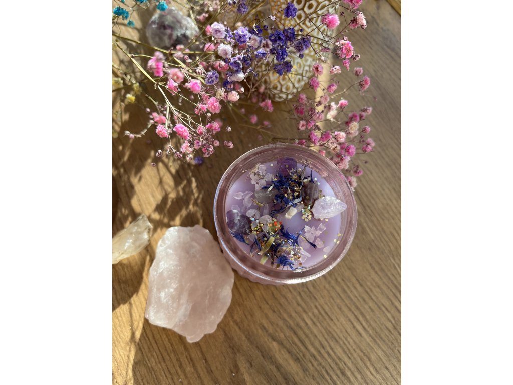 Svíčka je ručně odlitá z přírodního sojového vosku s bavlněným knotem a zdobená krystaly a sušenými květy. Každý kus je originál – nepravidelný, jedinečný a neopakovatelný.