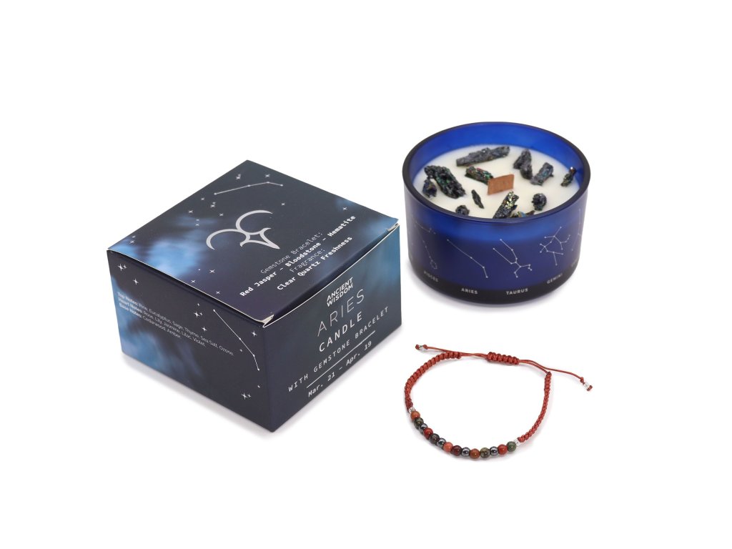 Zažehněte smělou a nebojácnou energii Berana s touto křišťálovou svíčkou Zodiac. Povzbuzující vůně Clear Quartz Freshness odráží dynamického a sebevědomého ducha tohoto ohnivého znamení a vytváří povznášející atmosféru pro nové začátky. Součástí sady je silný náramek z drahých kamenů s červeným jaspisem, krvavým kamenem a hematitem, pečlivě vybraný na podporu Berana.