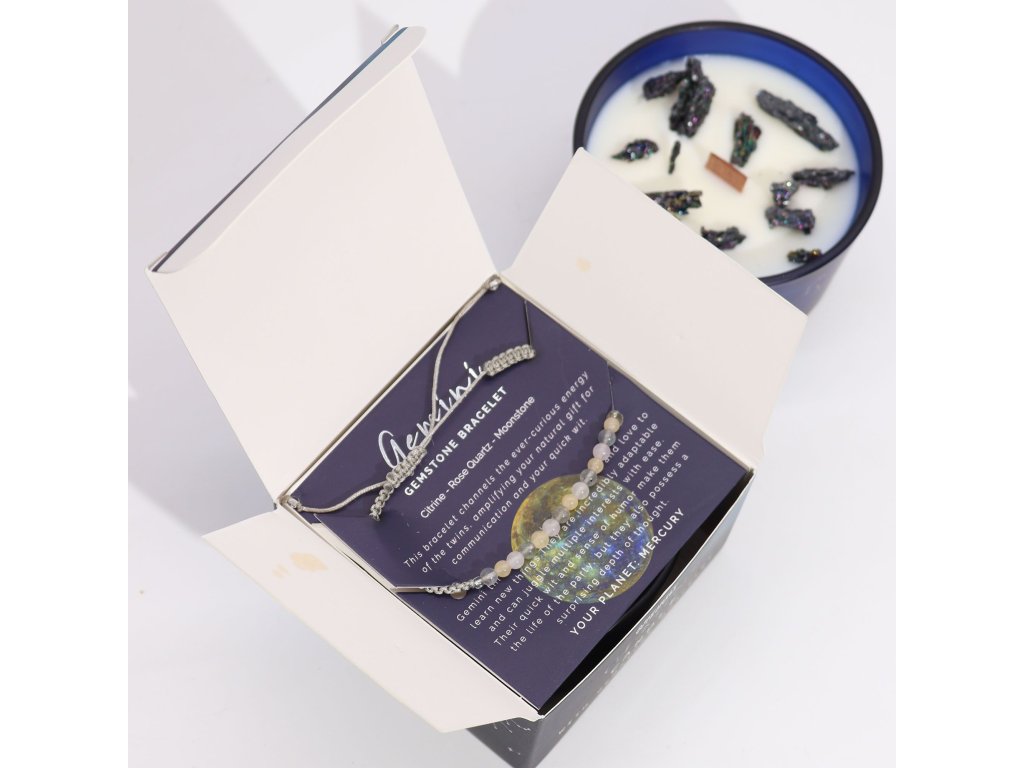 Tato zářivá kombinace svíčky a náramku je promyšleným dárkem nebo dokonalým doplňkem k rituálu vlastní péče a pomáhá Blížencům přijmout jejich dvojí povahu.