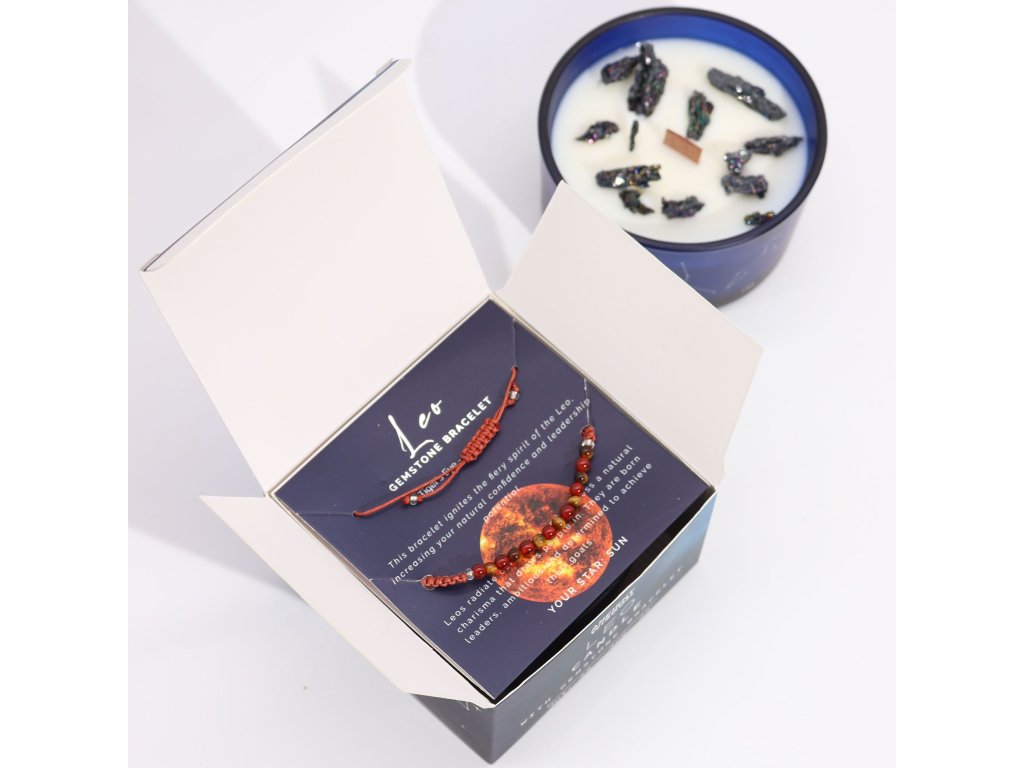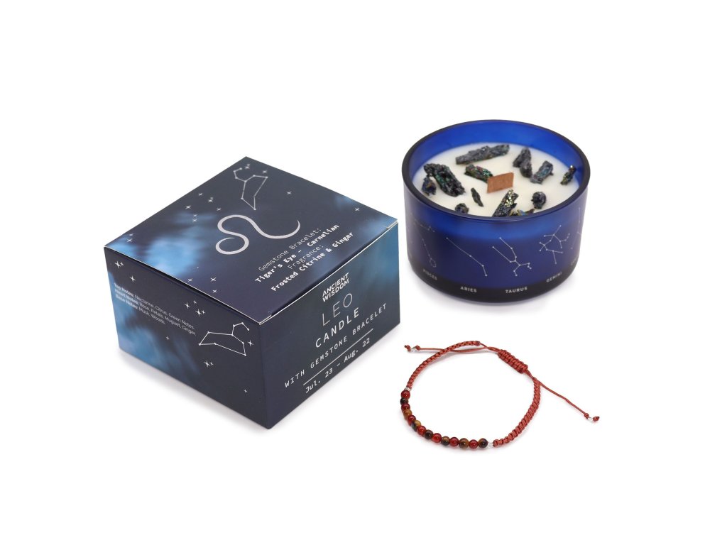 Uvolněte smělou a zářivou energii Lva s touto křišťálovou svíčkou Zodiac. Hřejivá povzbuzující vůně Frosted Citrine a Ginger naplňuje vzduch a dokonale ladí s živým a sebevědomým duchem tohoto ohnivého znamení. Sada obsahuje silný náramek z drahých kamenů vyrobený z tygřího oka a karneolu, pečlivě vybraný tak, aby umocnil Lvovy přednosti.