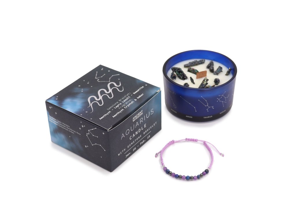 Oslavte vizionářského ducha Vodnáře s touto křišťálovou svíčkou Zodiac. Vůně ametystového krystalu a jantaru vytváří klidnou a inspirativní atmosféru. Jak svíčka hoří, objevují se třpytivé drahokamy, které umocňují spojení s Vodnářovou energií. Sada obsahuje drahokamový náramek vyrobený z ametystu, lapis lazuli a hematitu. Každý kámen je pečlivě vybírán tak, aby byl v souladu se silnými stránkami Vodnáře.